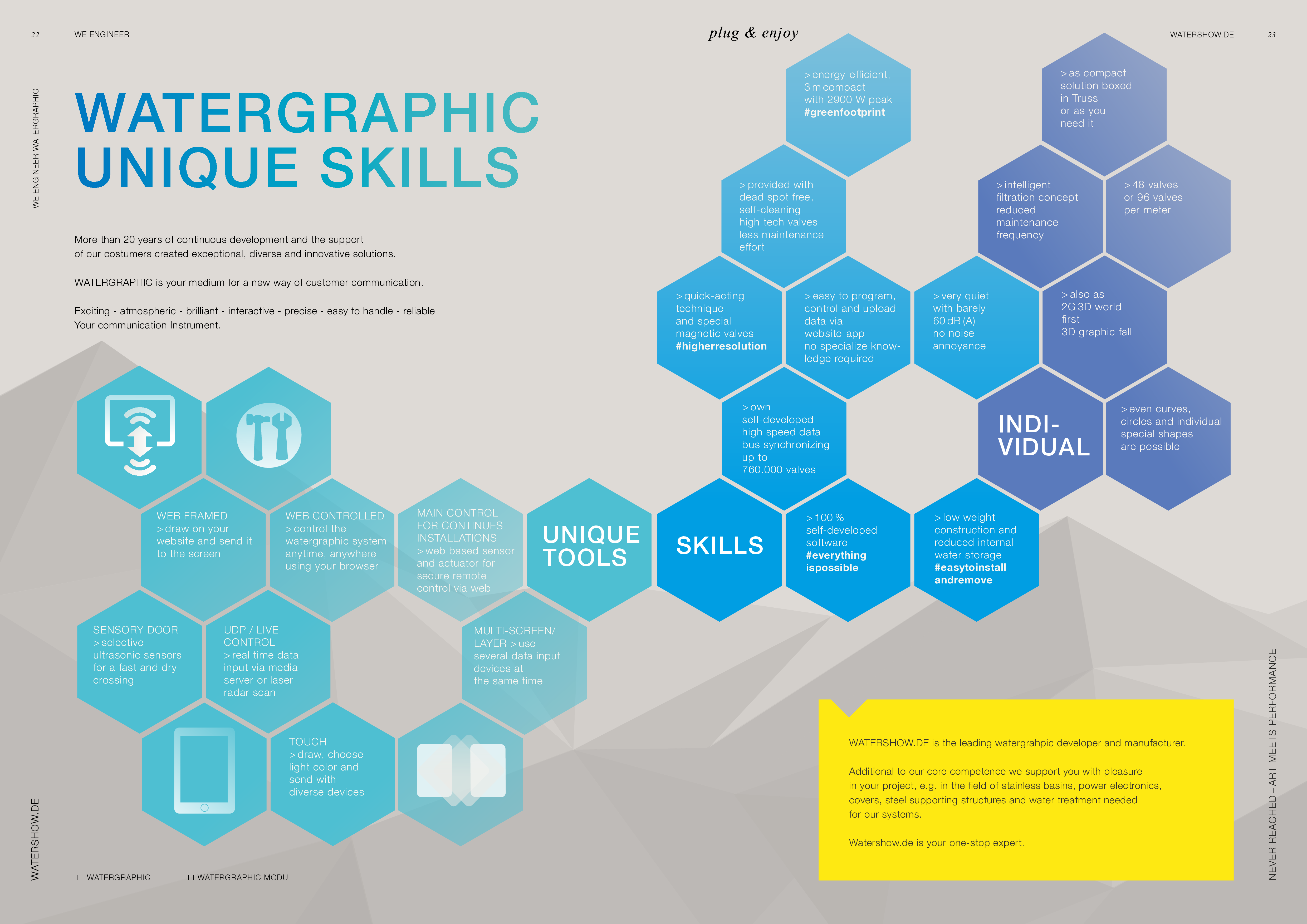 Watershow.de GmbH verwandelt Wasser in unvergessliche Erlebnisse. Von funkelnden Fontänen und eleganten Wasserwänden bis hin zu hochmodernen Wasserscreens, die Logos und Bilder mit fallenden Tropfen schreiben. Jede Show ist ein einzigartiges Highlight. Mit individuellen Lösungen, perfekter Technik und beeindruckender visueller Wirkung lässt Watershow.de Marken erstrahlen und Events unvergesslich werden.